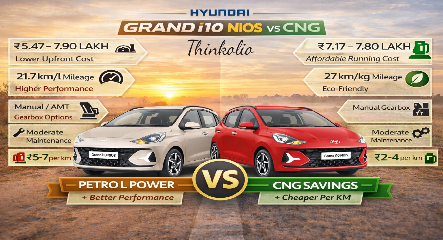 🚗 Hyundai Grand i10 Nios Petrol vs CNG – Detailed Comparison