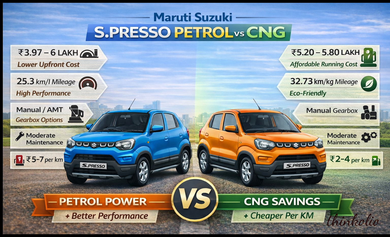 🚗 Maruti Suzuki S-Presso Petrol vs CNG – Full Feature Comparison